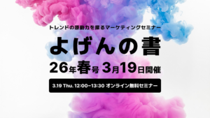 総合マーケティング会社で23年間、NBメーカーの商品開発・販促企画のアイディア創出のための調査に関わるとともに、2020年から師匠の「大久保惠司 氏(ソーシャリングラボ 代表/コプロシステム 元取締役副社長)」とともに企業のマーケター向けに毎月トレンドを発表するセミナーを継続開催する。2025年、大久保氏の逝去後に「よげんの書」をライフワークとして継続することを決意。