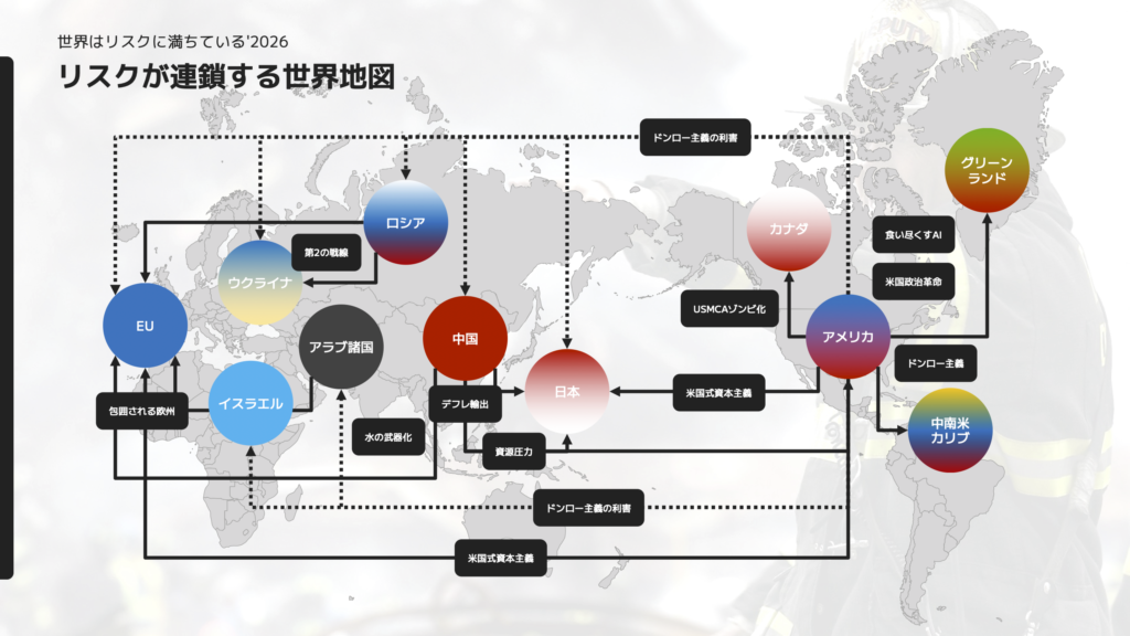 2026年の10大リスクのリストには、他にも「トランプのドンロー主義」「包囲される欧州」「ロシアの第二の戦線」「ユーザーを食い尽くすAI」など、重苦しい見出しが並んでいます。これらのリスクを世界地図の上にプロットしてみると、大きな「連鎖」が浮かび上がってきます。
