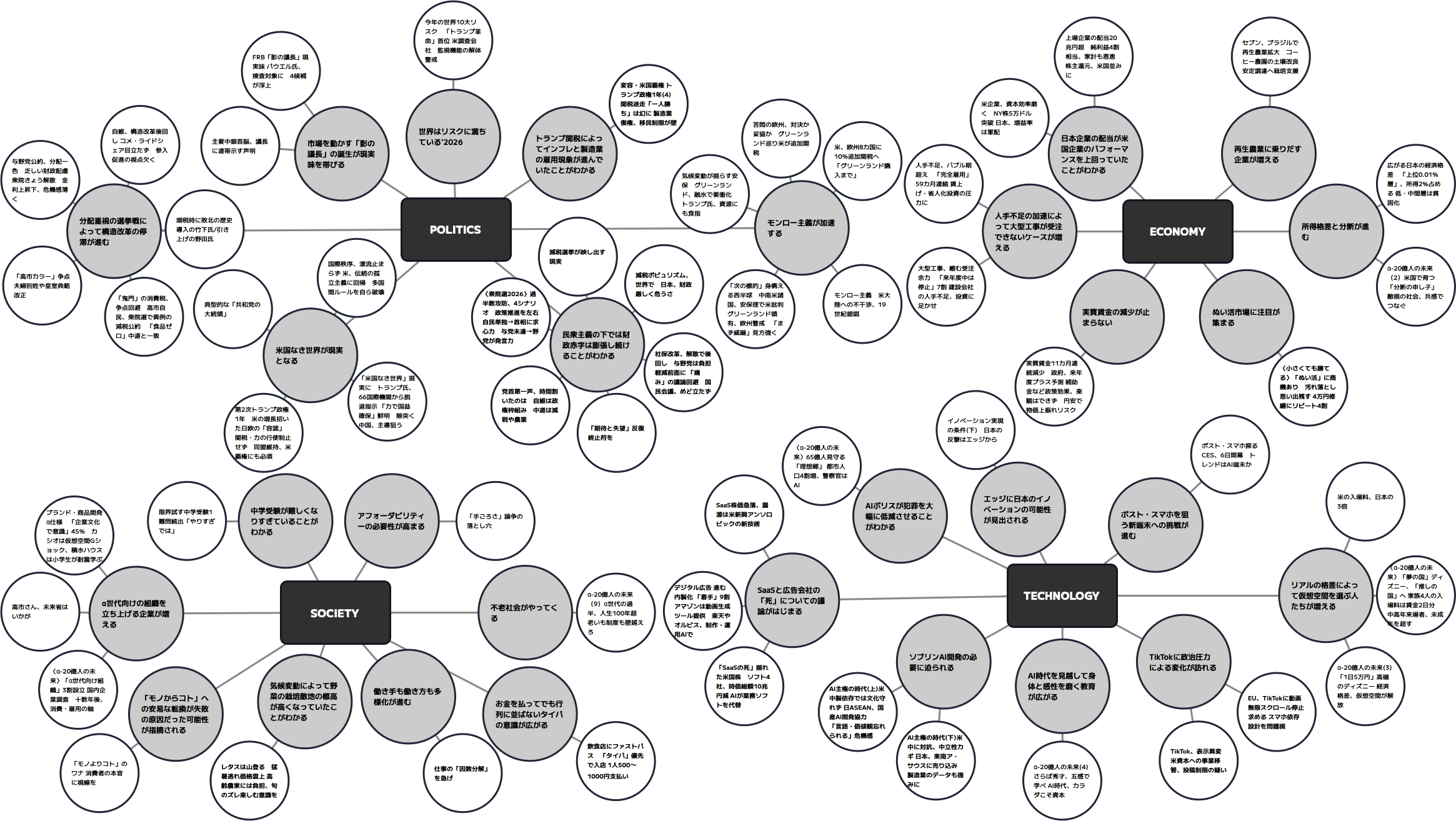 それは突発的な危機というよりも、これまで進んできた変化が前提になりつつあるという感覚です。政治では国際秩序の揺らぎが鮮明になり、経済では格差と分配の構図が深まり、社会ではα世代が現実のプレーヤーとして浮上し、テクノロジーではソブリンAIという言葉が訴えられはじめています。