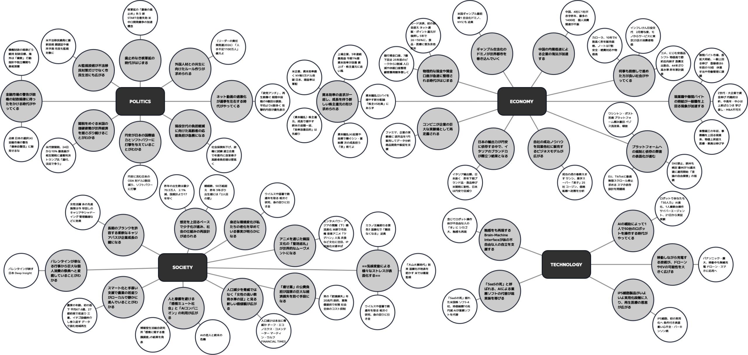 2026年2月のPEST分析を通じて確認されたのは、社会の前提となるルールの変化です。情報空間における意思決定の変容、現場労働の価値の一部再評価、ライフスタイルの個人化、テクノロジーの自律化など、これらの事象は個別に起きているように見えて、社会インフラの再定義という一つの方向性を示しています。