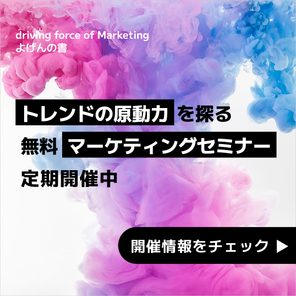 この記事は、トレンドの原動力を探るマーケティングセミナー「よげんの書」で発表した「よげん」をトピックごとに解説した記事です。よげんの書のウェブサイトから無料セミナーのお申込みや、講演資料やアーカイブ動画をご覧いただけますので、ご関心ありましたらお申込みください。